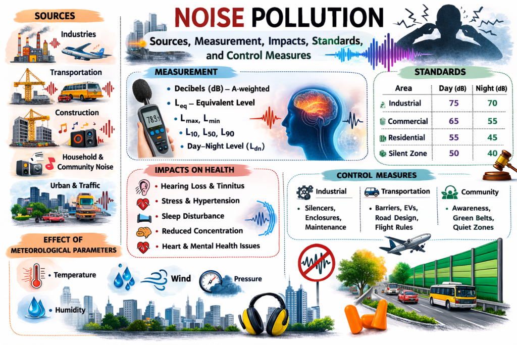 Noise Pollution: Sources, Measurement, Impacts, Standards, and Control Measures
